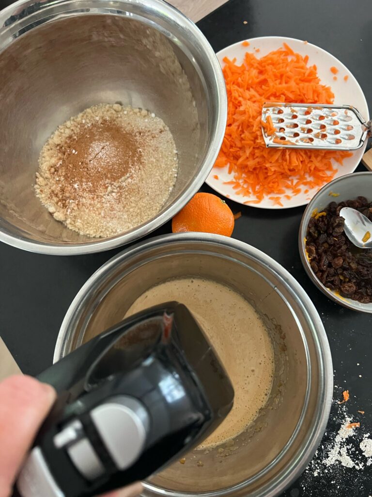 9. Spatel 280 g van de geraspte wortel en de rozijnen met het sinaasappelsap door het beslag.