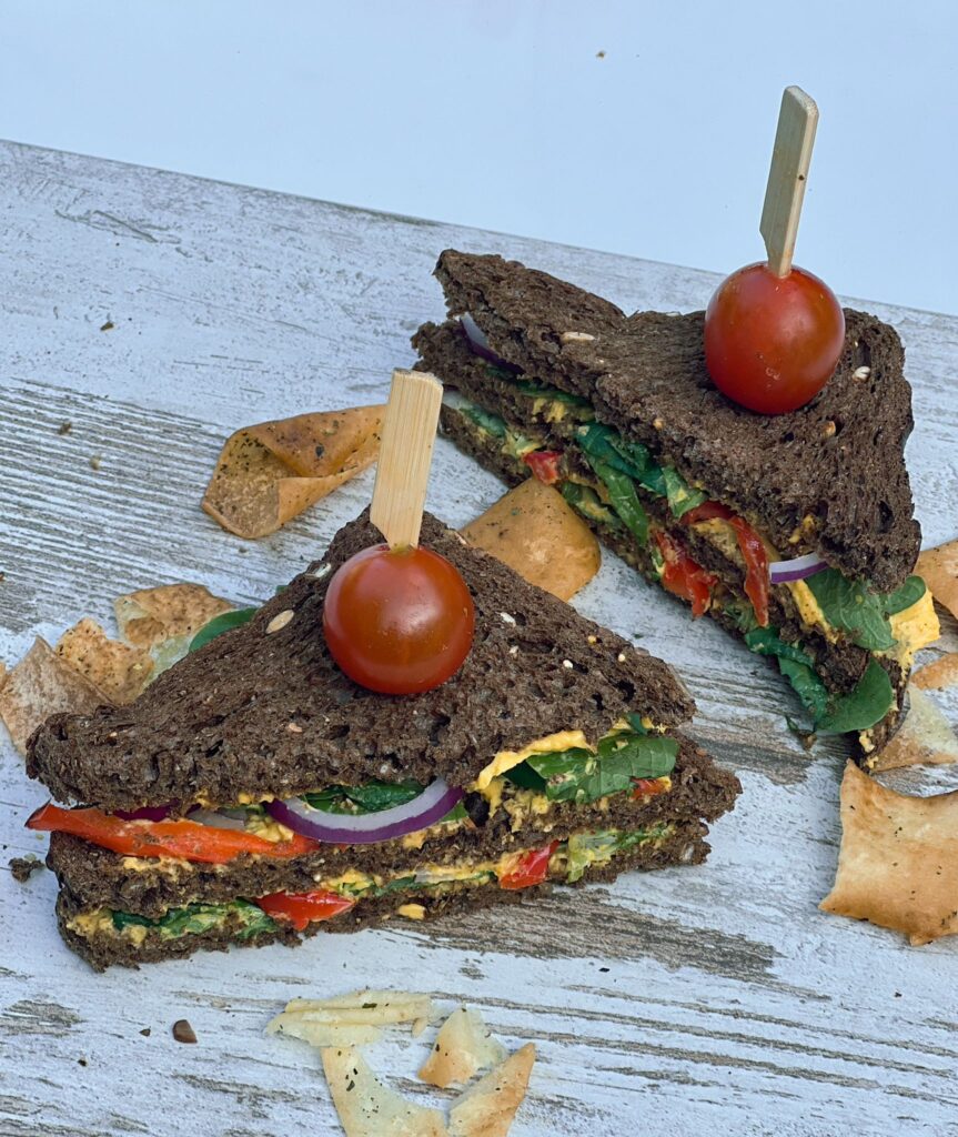 Snijd de boterhammen schuin door en om glijden te voorkomen, kun je er een prikker met een tomaatje in doen. Ziet er meteen leuk uit ook.